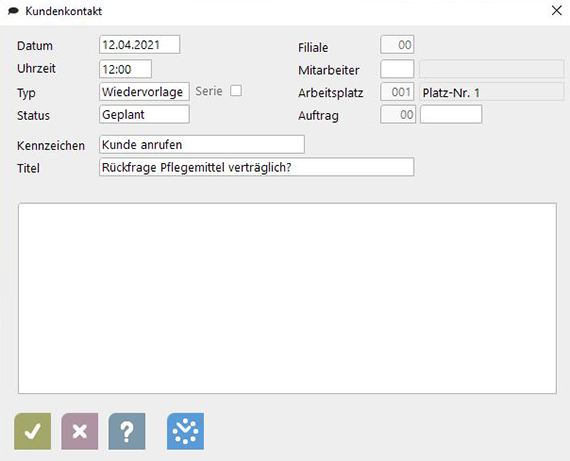 Während der Beratung, oder gleich im Anschluss legen Sie eine Wiedervorlage an, planen das Erinnerungs-Datum, wählen ein passendes Kontakt-Kennzeichen und hinterlegen Sie eine kurze Notiz. Schon haben Sie den zukünftigen Kontakt geplant.